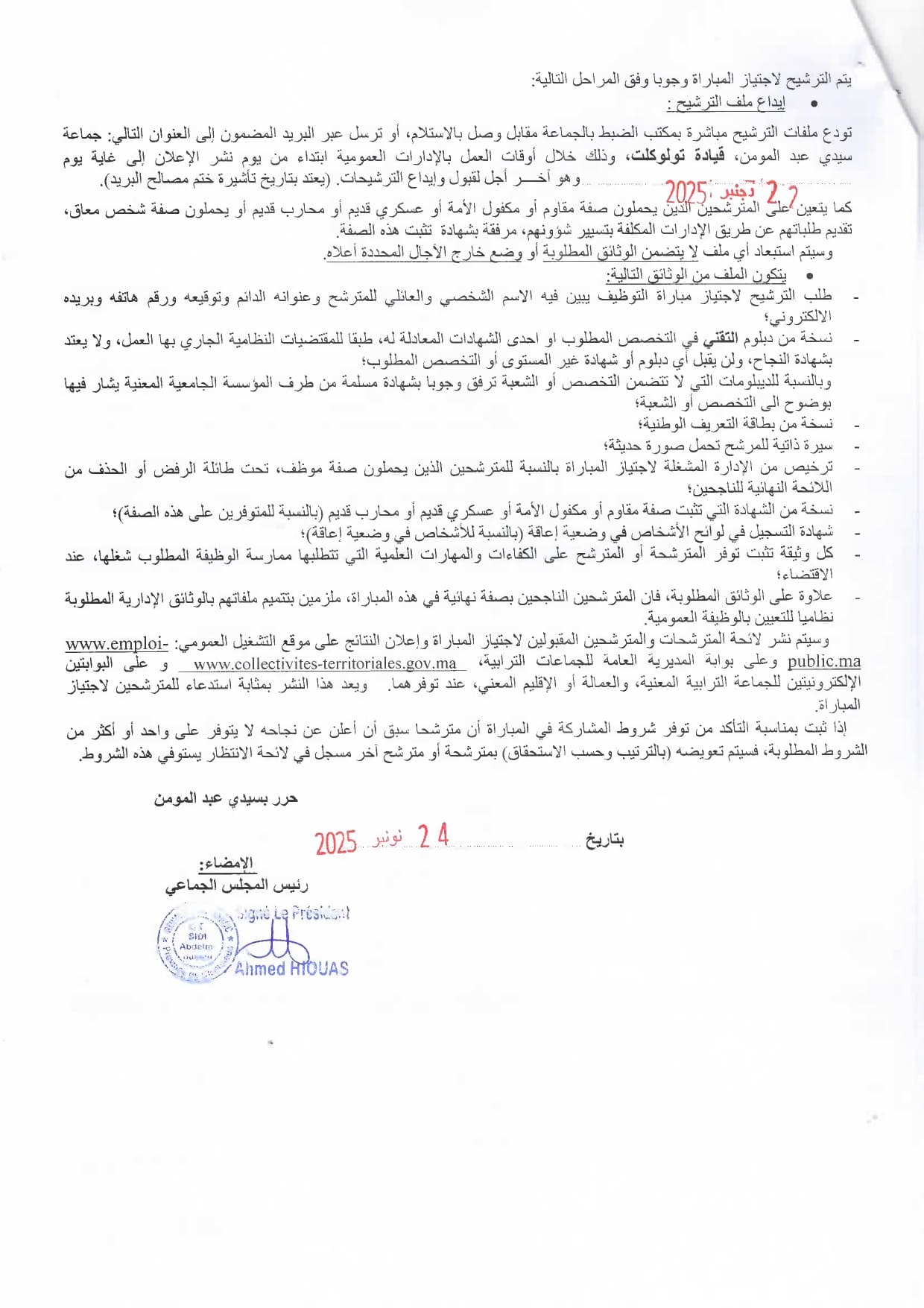 مباراة لتوظيف تقني من الدرجة الرابعة بجماعة سيدي عبد المومن
