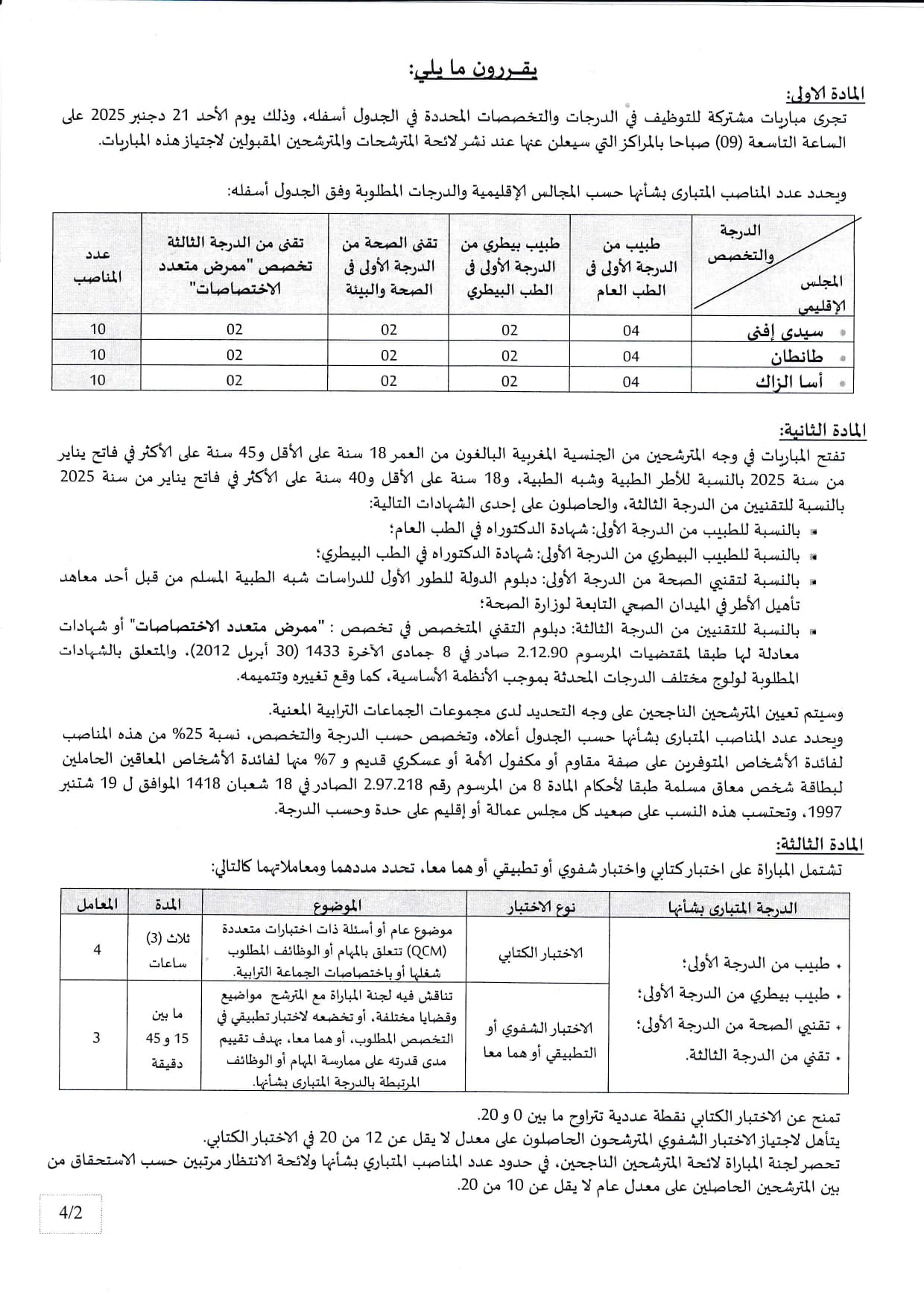 تُجرى مباريات مشتركة للتوظيف في درجات وتخصصات مختلفة بالمجالس الإقليمية ابتداءً من يوم الأحد 21 دجنبر 2025 على الساعة التاسعة صباحاً. تشمل المناصب المفتوحة: طبيب بيطري من الدرجة الأولى، طبيب من الدرجة الأولى في الطب العام، تقني صحة من الدرجة الأولى في الصحة والبيئة، وتقني من الدرجة الثالثة "متعدد التخصصات". وتخصص نسبة 25% من المناصب للمقاومين ومكفولي الأمة ونسبة 7% للأشخاص المعاقين.