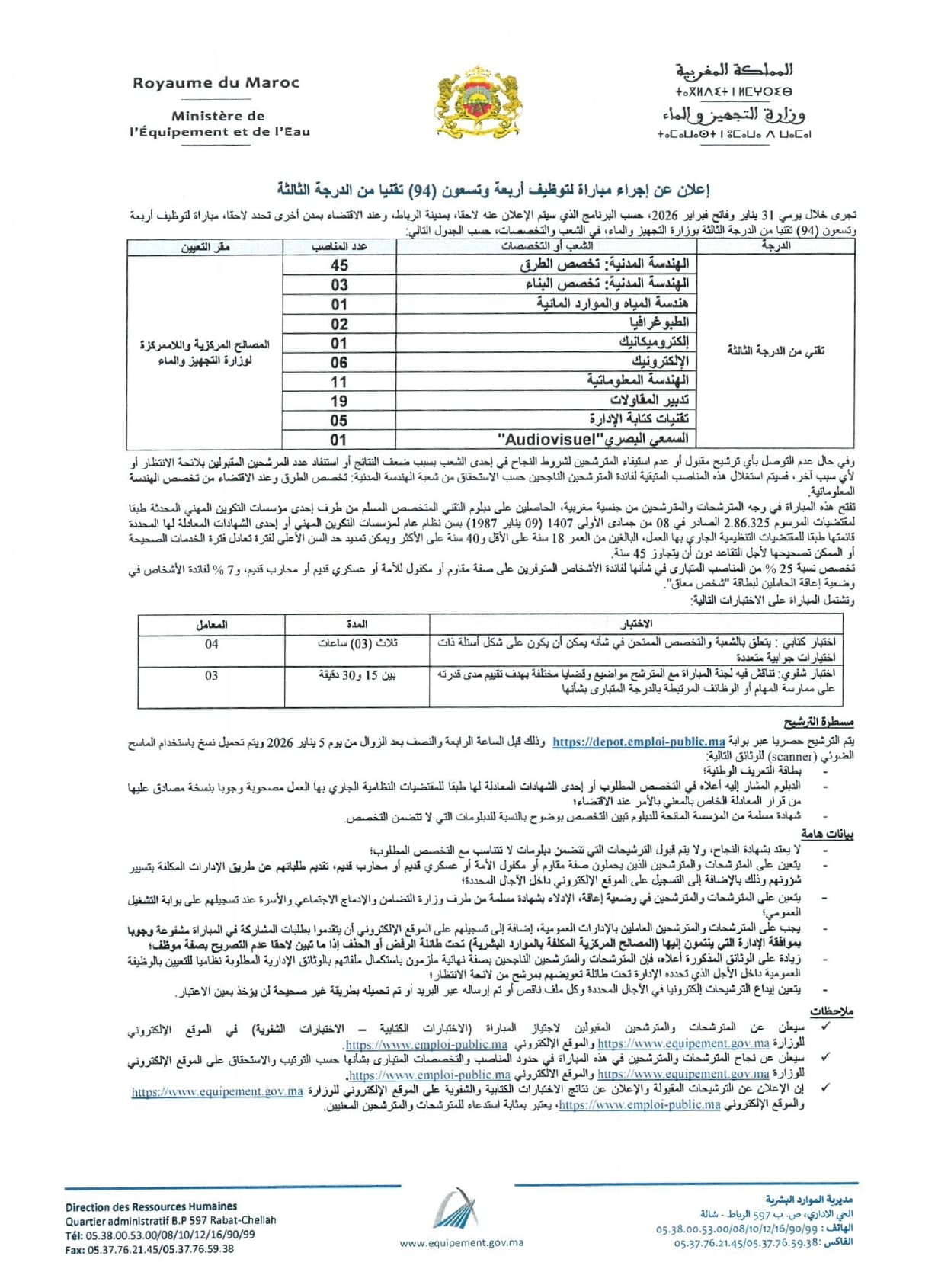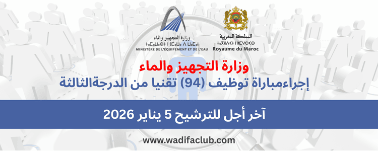 تعلن وزارة التجهيز والماء عن تنظيم مباراة لتوظيف أربعة وتسعين (94) تقنيا من الدرجة الثالثة، تجرى خلال يومي 31 يناير وفاتح فبراير 2026 بمدينة الرباط، وعند الاقتضاء بمدن أخرى تحدد لاحقا، وسيتم تعيين المترشحين الناجحين بالمصالح المركزية واللاممركزة للوزارة.