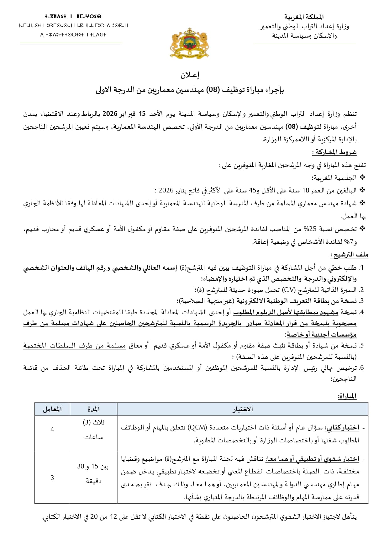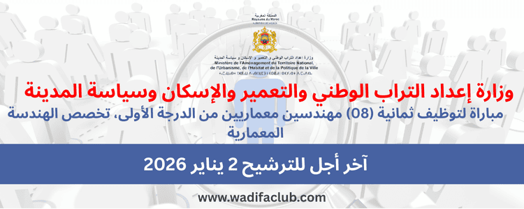 تنظم وزارة إعداد التراب الوطني والتعمير والإسكان وسياسة المدينة مباراة لتوظيف ثمانية (08) مهندسين معماريين من الدرجة الأولى، تخصص الهندسة المعمارية، وذلك يوم الأحد 15 فبراير 2026 بمدينة الرباط، وعند الاقتضاء بمدن أخرى، مع تعيين الناجحين بالإدارة المركزية أو المصالح اللاممركزة للوزارة.