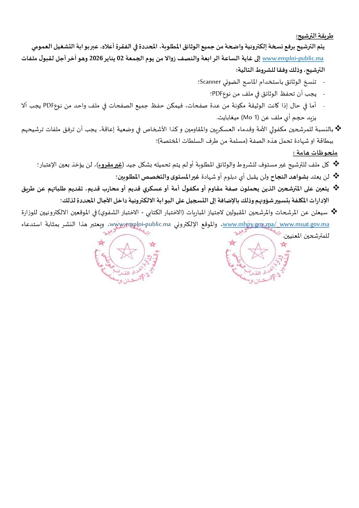 يتم إيداع الترشيحات حصريا عبر بوابة التشغيل العمومي www.emploi-public.ma، وذلك برفع نسخ إلكترونية واضحة من الوثائق المطلوبة بصيغة PDF قبل يوم الجمعة 02 يناير 2026 على الساعة الرابعة والنصف بعد الزوال، وكل ملف غير كامل أو غير مستوف للشروط أو غير مقروء لن يُقبل، مع نشر لوائح المترشحين المقبولين لاجتياز الامتحانين الكتابي والشفوي ونتائج المباراة على المواقع الإلكترونية للوزارة وبوابة التشغيل العمومي ويُعتبر هذا النشر بمثابة استدعاء.