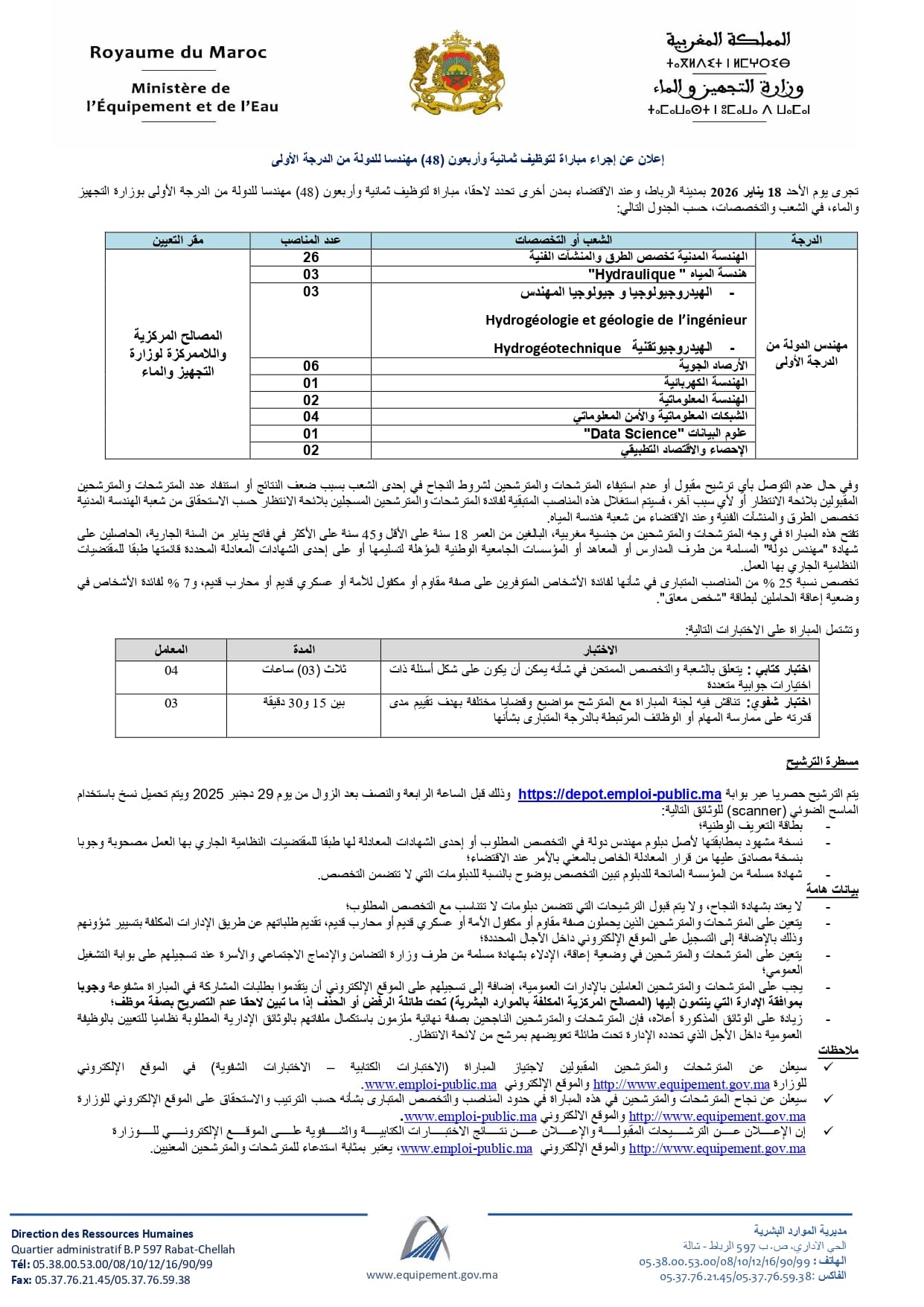 تعلن وزارة التجهيز والماء عن تنظيم مباراة لتوظيف ثمانية وأربعين (48) مهندسا للدولة من الدرجة الأولى، تجرى خلال يومي 18 و25 يناير 2026 بمدينة الرباط، وعند الاقتضاء بمدن أخرى، وسيتم تعيين المترشحين الناجحين بالمصالح المركزية واللاممركزة للوزارة حسب حاجياتها في التخصصات المشار إليها في الإعلان.
