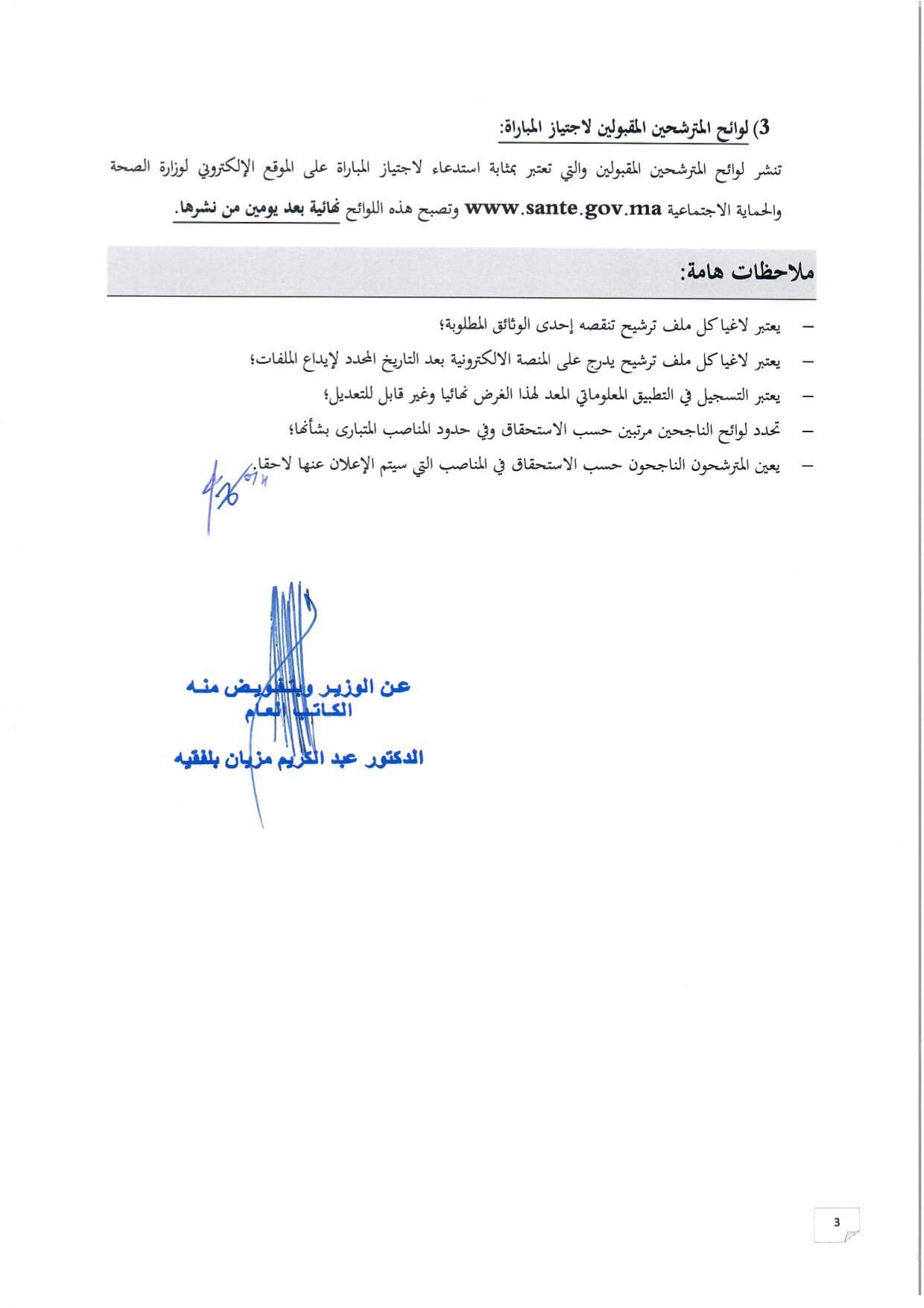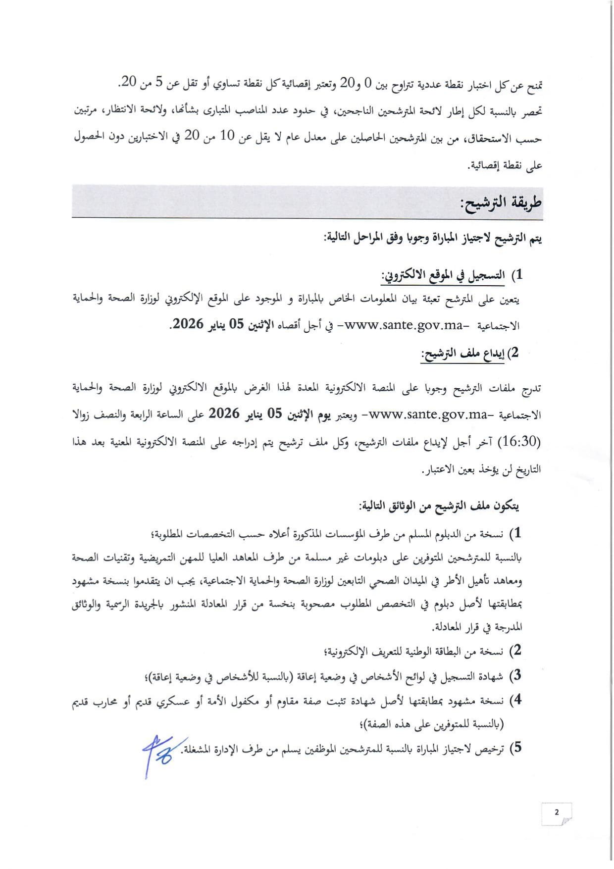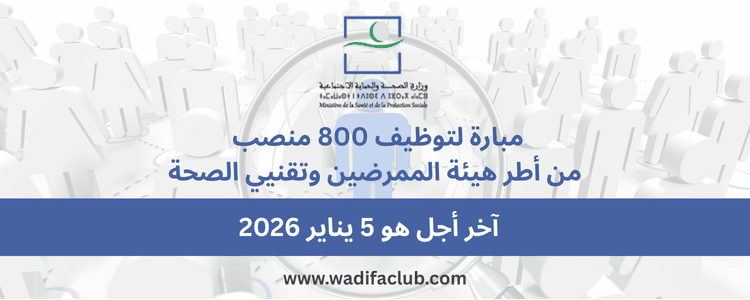 مباراة توظيف 800 ممرّض ومهني صحة بوزارة الصحة والحماية الاجتماعية 2026 تاريخ النشر: 2025-12-11 آخر أجل للتسجيل القبلي: 2026-01-05 تعلن وزارة الصحة والحماية الاجتماعية عن فتح مباراة لتوظيف في الدرجة الأولى (السلم 10) ضمن أطر هيئة الممرضين وتقنيي الصحة، والتي ستُجرى يوم الأحد 18 يناير 2026 على الساعة التاسعة صباحاً. يحدد عدد المناصب المتبارى بشأنها في 800 منصب موزعة حسب كل إطار من الأطر المذكورة وحسب التخصصات المطلوبة وفقاً للجدول المرفق، مع الإشارة إلى أنه يُحتفظ بـ 25% من المناصب المفتوحة لفائدة الأشخاص المتوفرين على صفة مقاوم أو مكفول الأمة أو عسكري قديم أو محارب قديم و 7% منها لفائدة الأشخاص في وضعية إعاقة. تُجرى المباراة بالمراكز المذكورة التالية: الرشيدية، وجدة، فاس، تطوان، الرباط، الدار البيضاء، بني ملال، مراكش، أكادير، كلميم، العيون، ووادي الذهب. تفتح المباراة في وجه المترشحين الحاملين للجنسية المغربية، البالغين من العمر 18 سنة على الأقل و 45 سنة على الأكثر في فاتح يناير من السنة الجارية، والحاصلين على دبلوم الإجازة المسلم من قبل أحد المعاهد العليا للمهن التمريضية وتقنيات الصحة أو دبلوم الدولة المطور للدراسات شبه الطبية المسلم من قبل أحد معاهد تأهيل الأطر في الميدان الصحي التابعين لوزارة الصحة والحماية الاجتماعية أو إحدى الشهادات المعادلة لها طبقاً للمقتضيات التنظيمية الجاري بها العمل. تتكون المباراة من نوعين من الاختبارات، الأول هو اختبار كتابي ذو معامل 2 ومدته ساعتان (2)، ويتضمن أسئلة متعددة الاختيارات حول الصحة العامة. أما النوع الثاني فهو اختبار تطبيقي ذو معامل 3 ومدته أيضاً ساعتان (2)، يتضمن أسئلة مباشرة أو أسئلة متعددة الاختيارات، مرتبطة بالتخصصات المطلوبة، وهدفه تقييم مدى قدرة المترشح على القيام بالمهام أو الوظائف المرتبطة بالدرجة المتبارى بشأنها. للمزيد من التفاصيل حول التخصصات المطلوبة وإجراءات الترشيح، يرجى الاطلاع على الجدول المرفق (في النسخة الأصلية للقرار). مشاركة الإعلان: