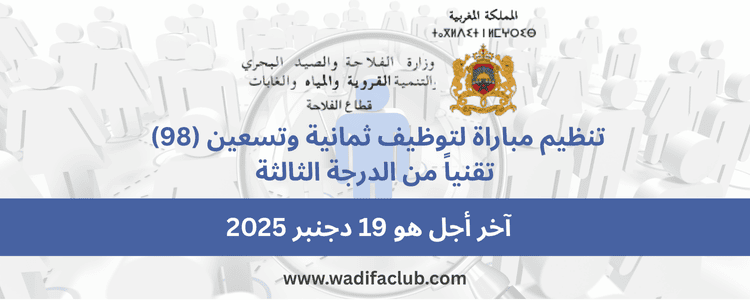 تعلن وزارة الفلاحة والصيد البحري والتنمية القروية والمياه والغابات (قطاع الفلاحة) عن تنظيم مباراة لتوظيف ثمانية وتسعين (98) تقنياً من الدرجة الثالثة. من المقرر أن تبدأ المباراة ابتداءً من يوم الأحد 04 يناير 2026.