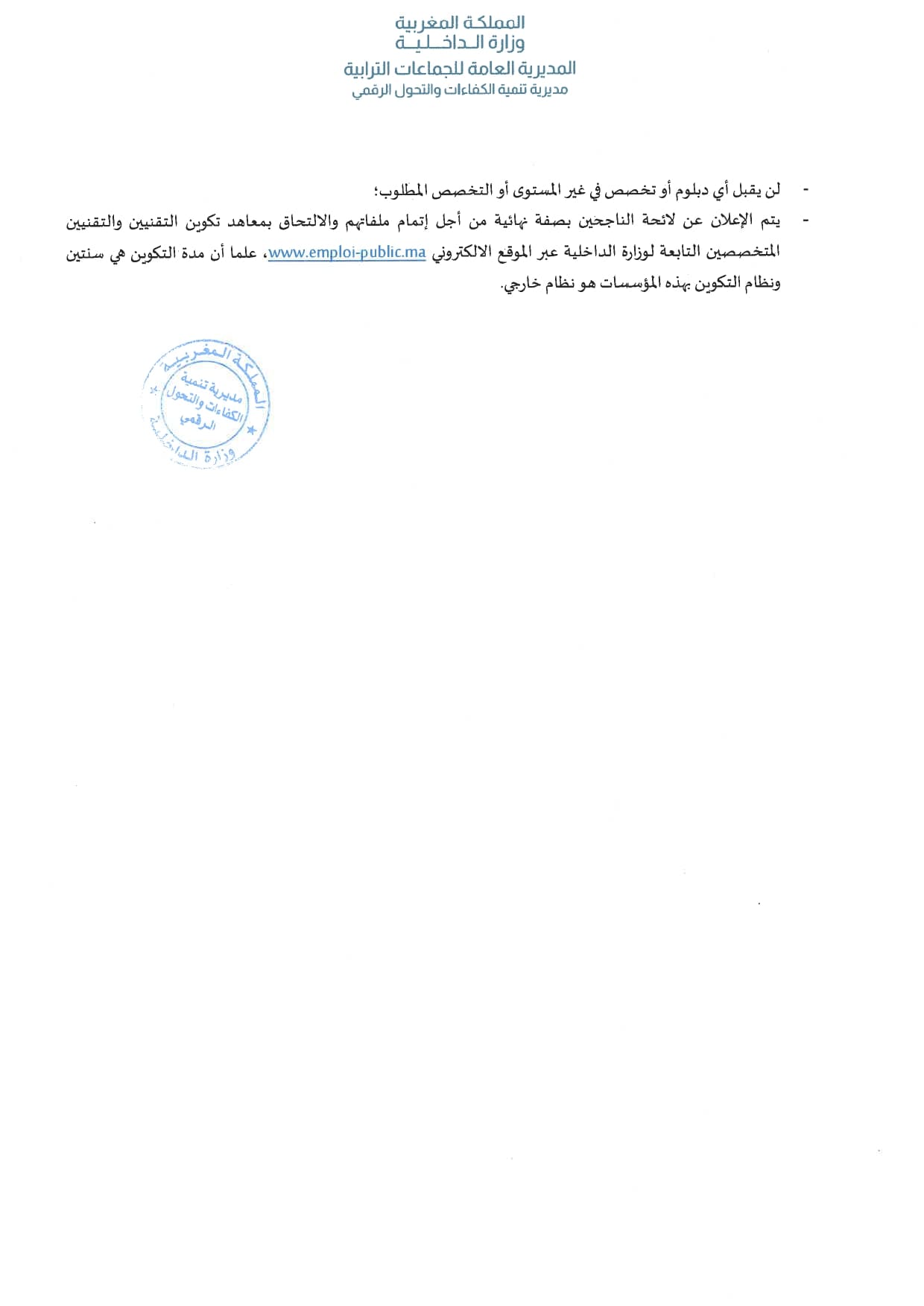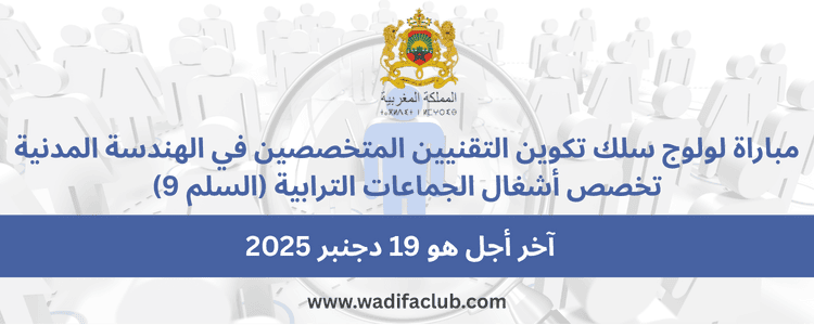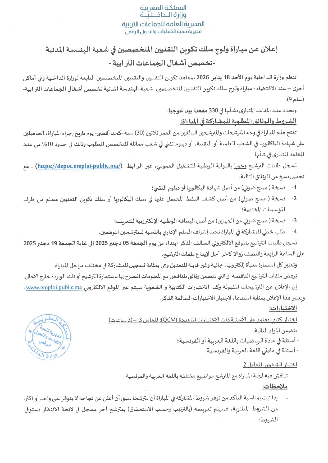 تنظم وزارة الداخلية مباراة لولوج سلك تكوين التقنيين المتخصصين في الهندسة المدنية تخصص أشغال الجماعات الترابية (السلم 9)، ابتداءً من يوم الأحد 18 يناير 2026، وتحدد عدد المناصب المتبارى بشأنها في 330 مقعداً . تفتح هذه المباراة في وجه المترشحين الحاصلين على شهادة البكالوريا في الشعب العلمية أو التقنية، أو دبلوم تقني في شعب مماثلة للتخصص المطلوب، والبالغين من العمر ثلاثين (30) سنة كحد أقصى، وتتمثل الاختبارات في اختبار كتابي على شكل أسئلة متعددة الاختيارات (QCM) بمعامل 3 واختبار شفوي بمعامل 2.