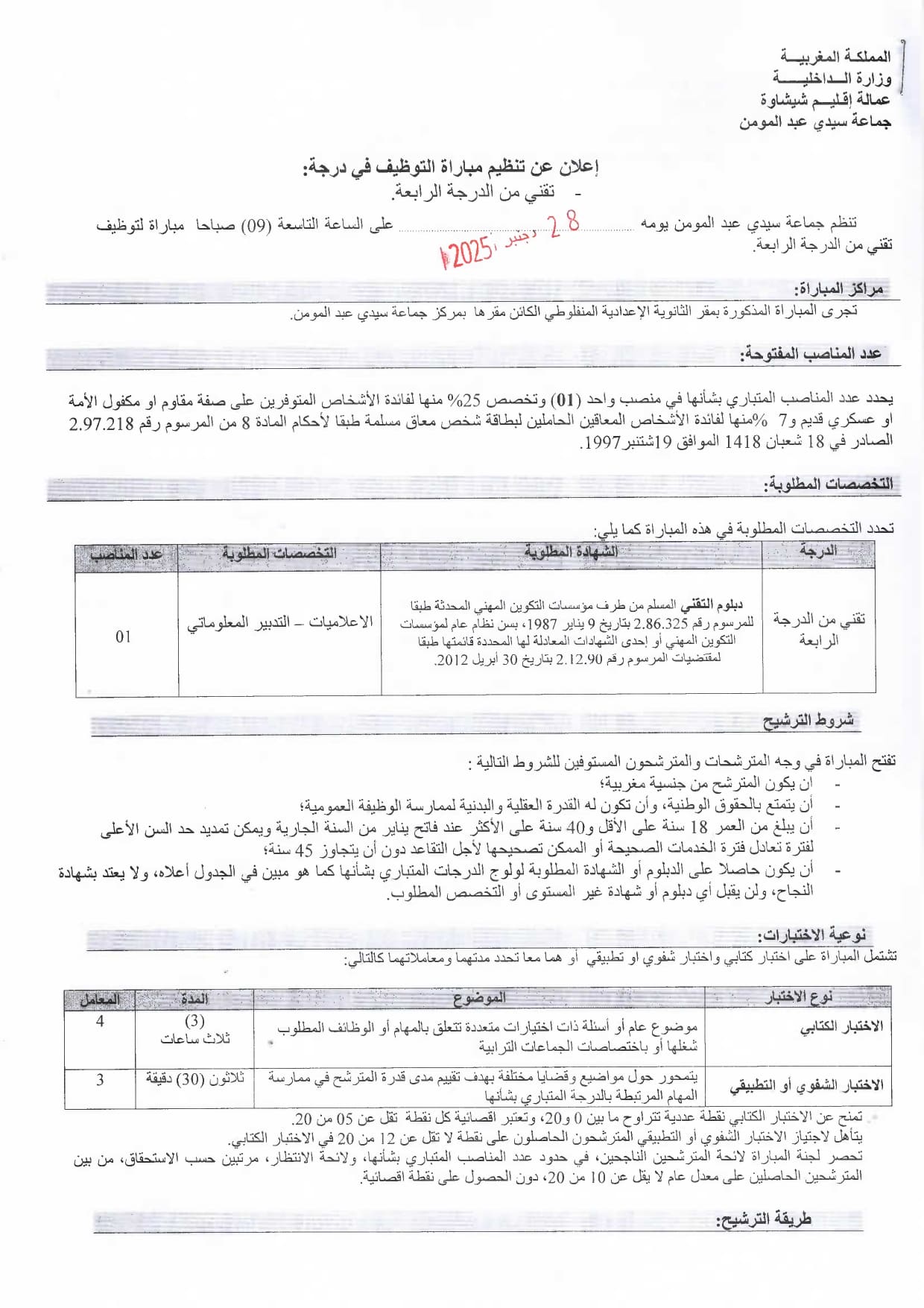 تُعلن جماعة سيدي عبد المومن عن تنظيم مباراة لتوظيف تقني من الدرجة الرابعة، وذلك يوم الأحد 28 دجنبر 2025 على الساعة التاسعة (09) صباحاً. سيُجرى هذا الاختبار بمقر الثانوية الإعدادية المنفلوطي الكائن بمركز جماعة سيدي عبد المومن.