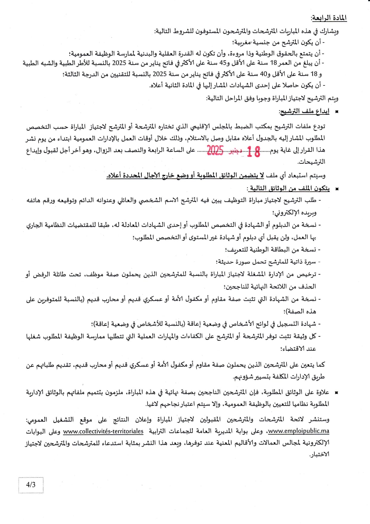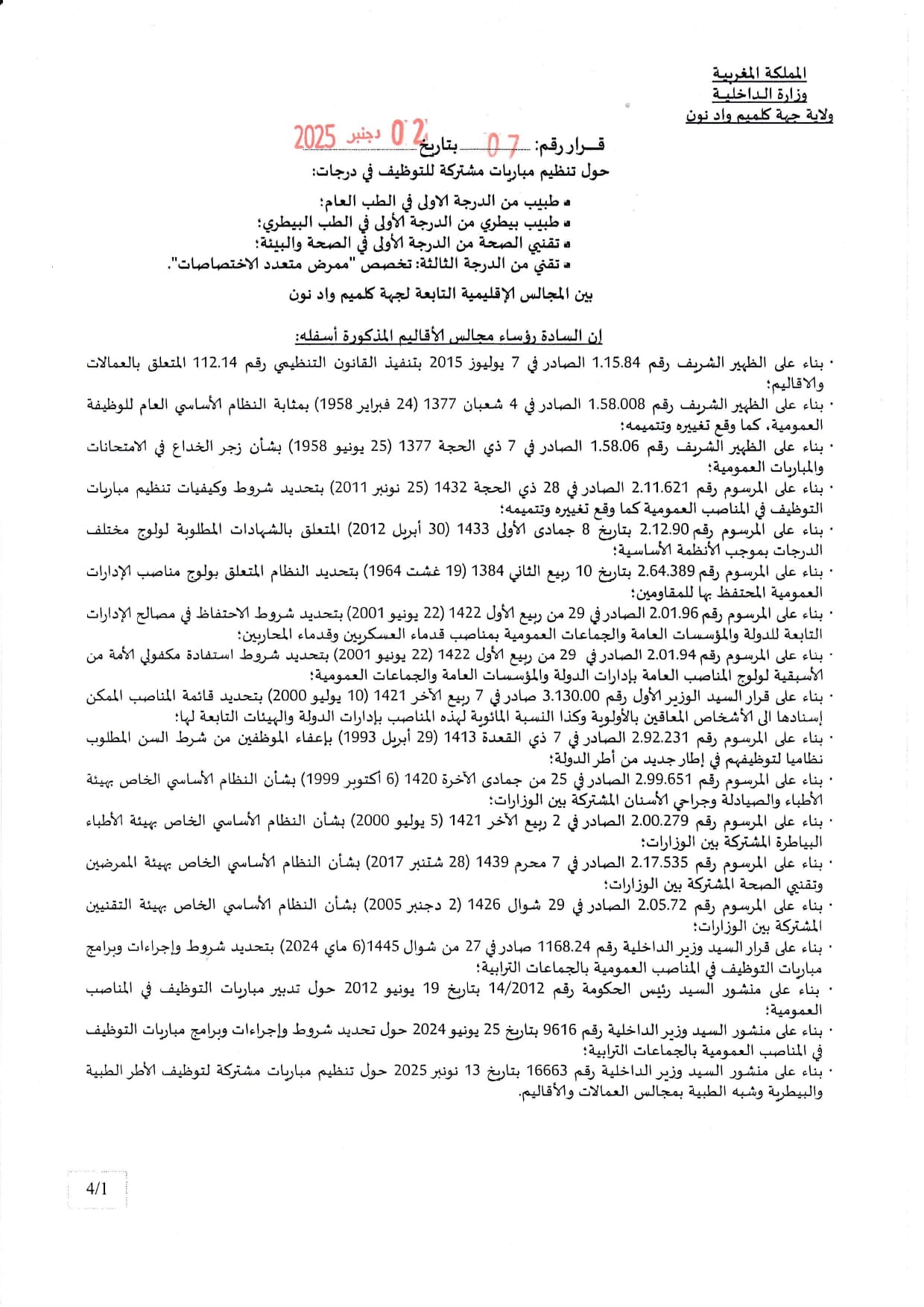تُجرى مباريات مشتركة للتوظيف في درجات وتخصصات مختلفة بالمجالس الإقليمية ابتداءً من يوم الأحد 21 دجنبر 2025 على الساعة التاسعة صباحاً. تشمل المناصب المفتوحة: طبيب بيطري من الدرجة الأولى، طبيب من الدرجة الأولى في الطب العام، تقني صحة من الدرجة الأولى في الصحة والبيئة، وتقني من الدرجة الثالثة "متعدد التخصصات". وتخصص نسبة 25% من المناصب للمقاومين ومكفولي الأمة ونسبة 7% للأشخاص المعاقين.