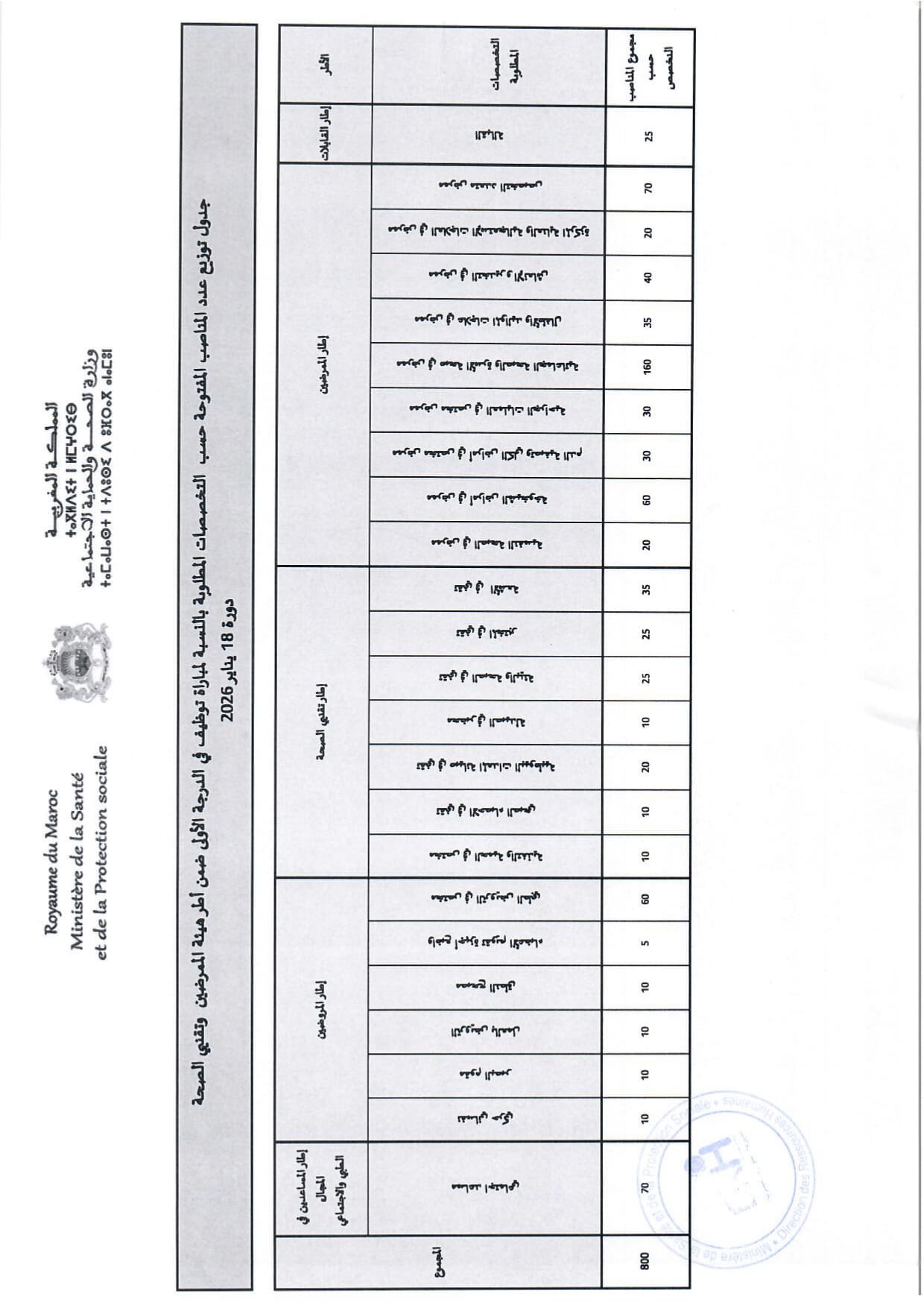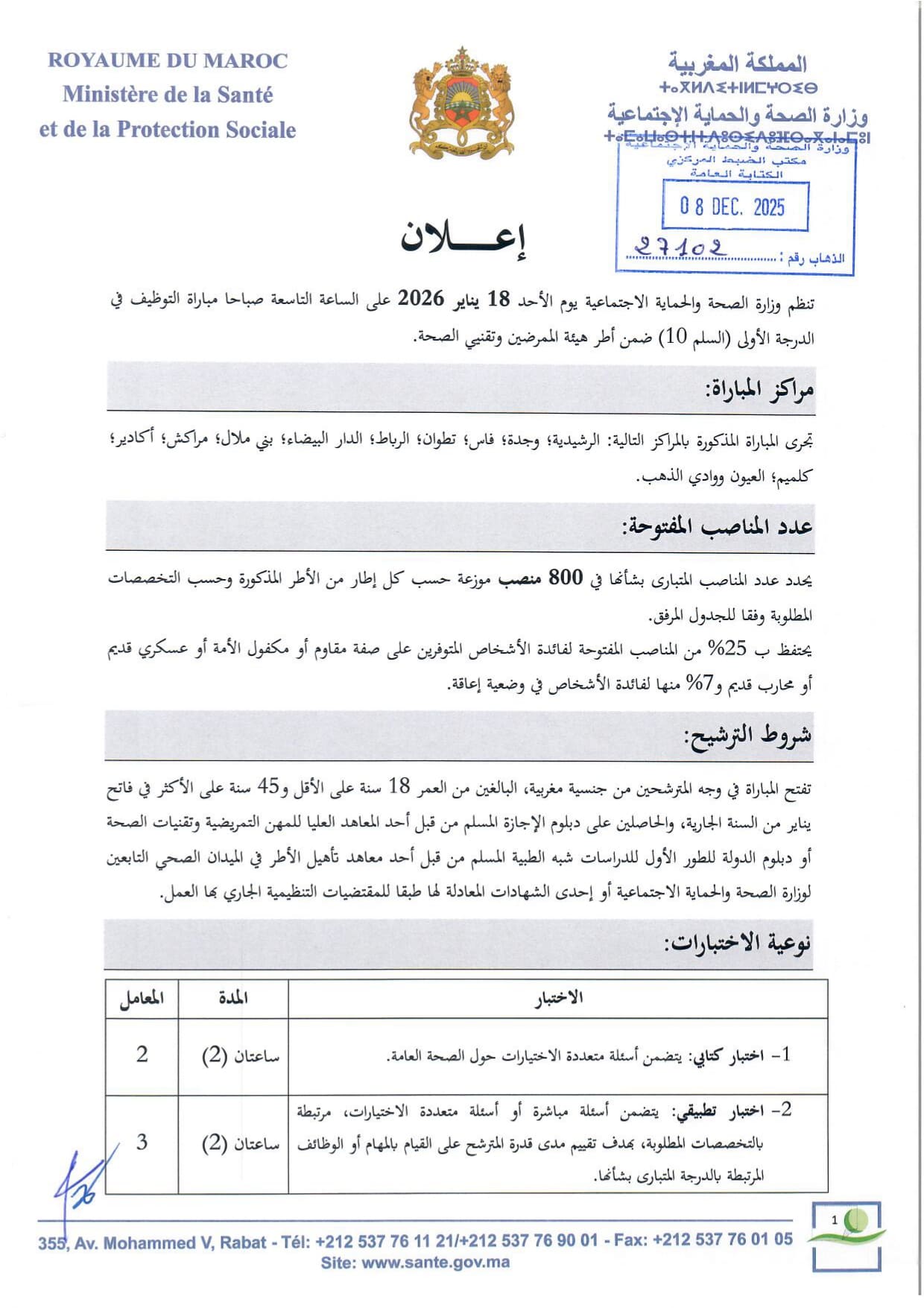 مباراة توظيف 800 ممرّض ومهني صحة بوزارة الصحة والحماية الاجتماعية 2026 تاريخ النشر: 2025-12-11 آخر أجل للتسجيل القبلي: 2026-01-05 تعلن وزارة الصحة والحماية الاجتماعية عن فتح مباراة لتوظيف في الدرجة الأولى (السلم 10) ضمن أطر هيئة الممرضين وتقنيي الصحة، والتي ستُجرى يوم الأحد 18 يناير 2026 على الساعة التاسعة صباحاً. يحدد عدد المناصب المتبارى بشأنها في 800 منصب موزعة حسب كل إطار من الأطر المذكورة وحسب التخصصات المطلوبة وفقاً للجدول المرفق، مع الإشارة إلى أنه يُحتفظ بـ 25% من المناصب المفتوحة لفائدة الأشخاص المتوفرين على صفة مقاوم أو مكفول الأمة أو عسكري قديم أو محارب قديم و 7% منها لفائدة الأشخاص في وضعية إعاقة. تُجرى المباراة بالمراكز المذكورة التالية: الرشيدية، وجدة، فاس، تطوان، الرباط، الدار البيضاء، بني ملال، مراكش، أكادير، كلميم، العيون، ووادي الذهب. تفتح المباراة في وجه المترشحين الحاملين للجنسية المغربية، البالغين من العمر 18 سنة على الأقل و 45 سنة على الأكثر في فاتح يناير من السنة الجارية، والحاصلين على دبلوم الإجازة المسلم من قبل أحد المعاهد العليا للمهن التمريضية وتقنيات الصحة أو دبلوم الدولة المطور للدراسات شبه الطبية المسلم من قبل أحد معاهد تأهيل الأطر في الميدان الصحي التابعين لوزارة الصحة والحماية الاجتماعية أو إحدى الشهادات المعادلة لها طبقاً للمقتضيات التنظيمية الجاري بها العمل. تتكون المباراة من نوعين من الاختبارات، الأول هو اختبار كتابي ذو معامل 2 ومدته ساعتان (2)، ويتضمن أسئلة متعددة الاختيارات حول الصحة العامة. أما النوع الثاني فهو اختبار تطبيقي ذو معامل 3 ومدته أيضاً ساعتان (2)، يتضمن أسئلة مباشرة أو أسئلة متعددة الاختيارات، مرتبطة بالتخصصات المطلوبة، وهدفه تقييم مدى قدرة المترشح على القيام بالمهام أو الوظائف المرتبطة بالدرجة المتبارى بشأنها. للمزيد من التفاصيل حول التخصصات المطلوبة وإجراءات الترشيح، يرجى الاطلاع على الجدول المرفق (في النسخة الأصلية للقرار). مشاركة الإعلان: