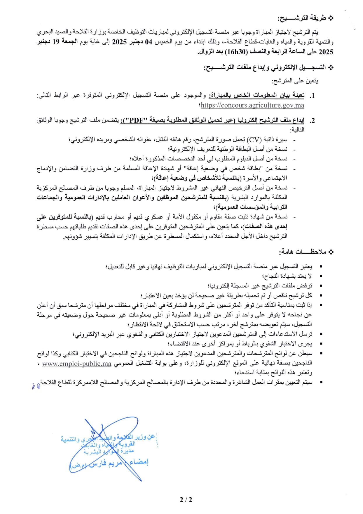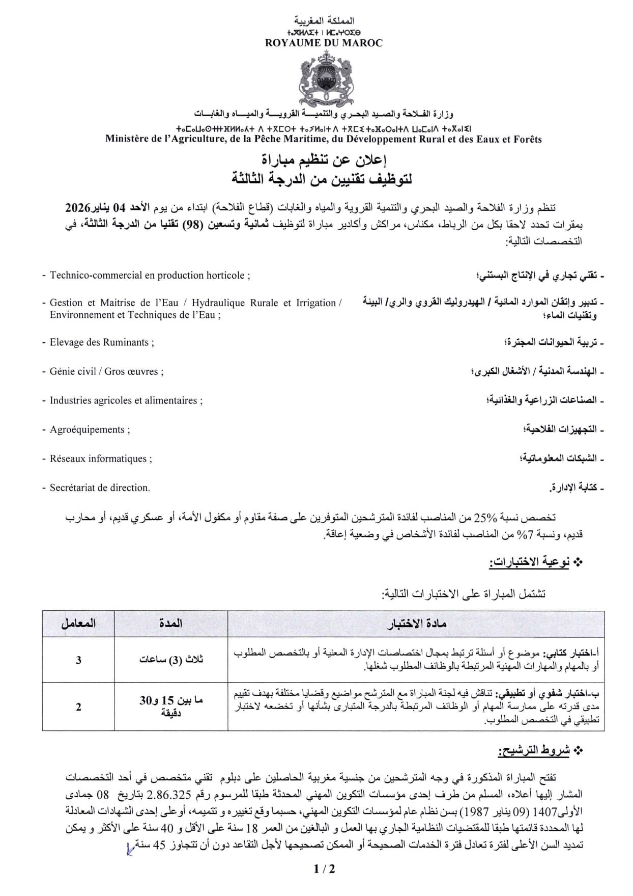 تعلن وزارة الفلاحة والصيد البحري والتنمية القروية والمياه والغابات (قطاع الفلاحة) عن تنظيم مباراة لتوظيف ثمانية وتسعين (98) تقنياً من الدرجة الثالثة. من المقرر أن تبدأ المباراة ابتداءً من يوم الأحد 04 يناير 2026.